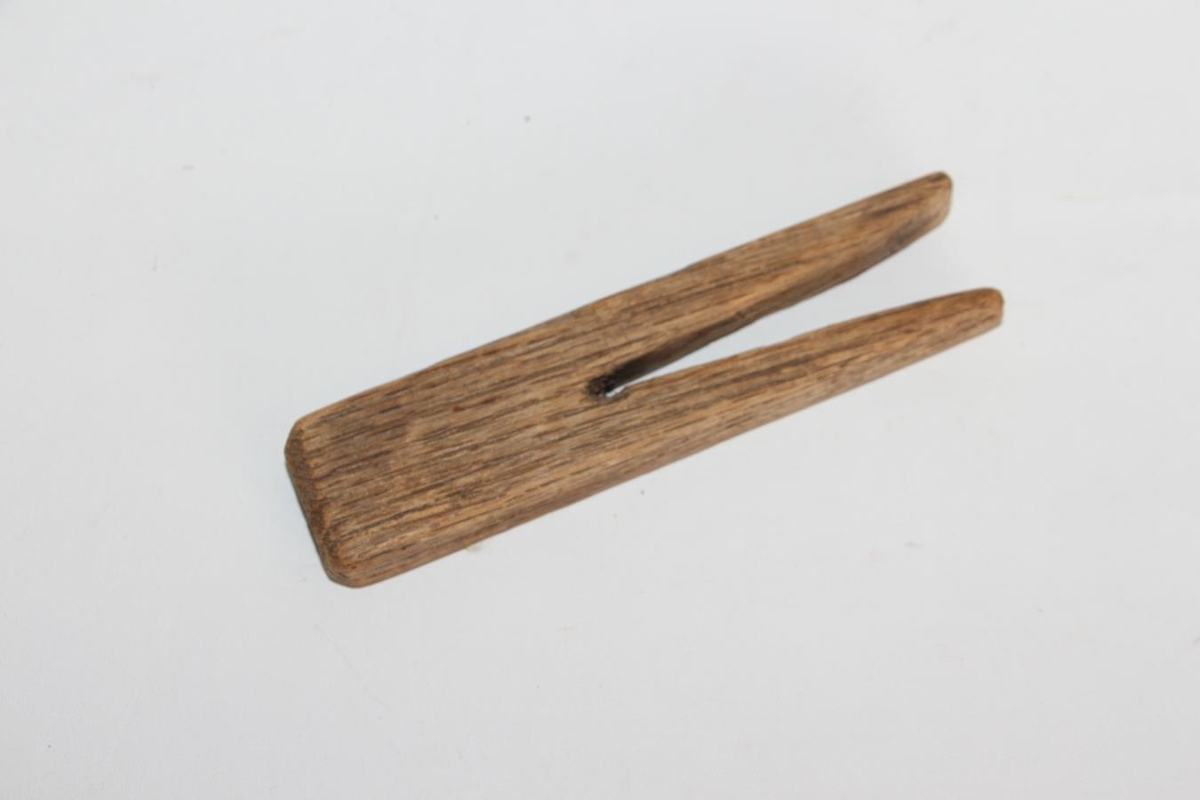 Þvottaklemma úr rekavið. L. 12,4 cm. Br. 2,7 cm. Þ. 1,2 cm. Lengd á klauf er 7,5 cm. Hringur er efst en breikkar svo niður. Endar eru tálgaðir í spíss að innan. Handgerð.