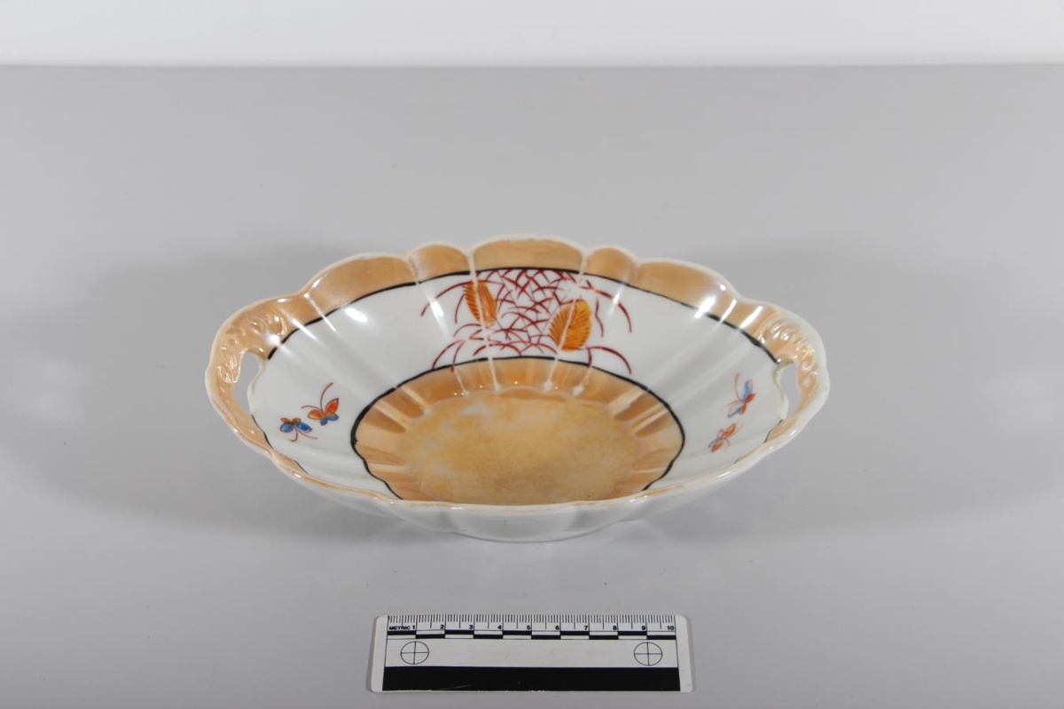 Kökuskál úr hvítum leir. L. 22 cm. Br. 14,4 cm. H. 5,5 cm. Bylgjótt mynstur upphleypt allan hringinn. Er með eyru sínu hvoru megin. Gul/ gyllt rönd efst og í botninn. Svartar rendur eru neðan og ofan við gulu rendurnar. Í hvítu röndinni eru strá og fiðrildi.