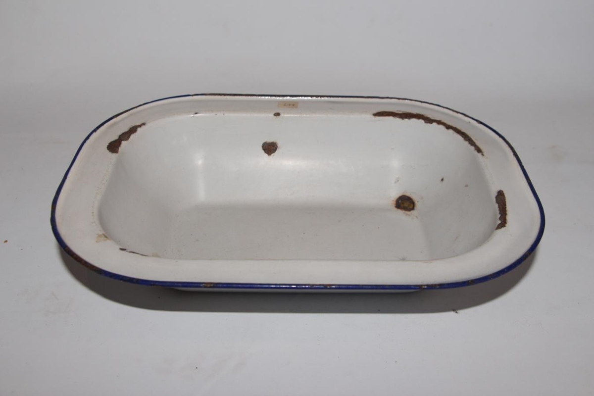 Fat úr emaljeruðu járni. L. 26 cm. Br. 19 cm. H. 5,3 cm. Hvítt á litinn með blárri rönd á brúninni. Kantur er flatur og útbrettur, 2,5 cm. Gat hefur verið komið á tvö horn en fyllt hefur verið í þau með gylltri málmblöndu. Þó nokkuð er um sár á emaljeringunni og þar er fatið orðið ryðgað.