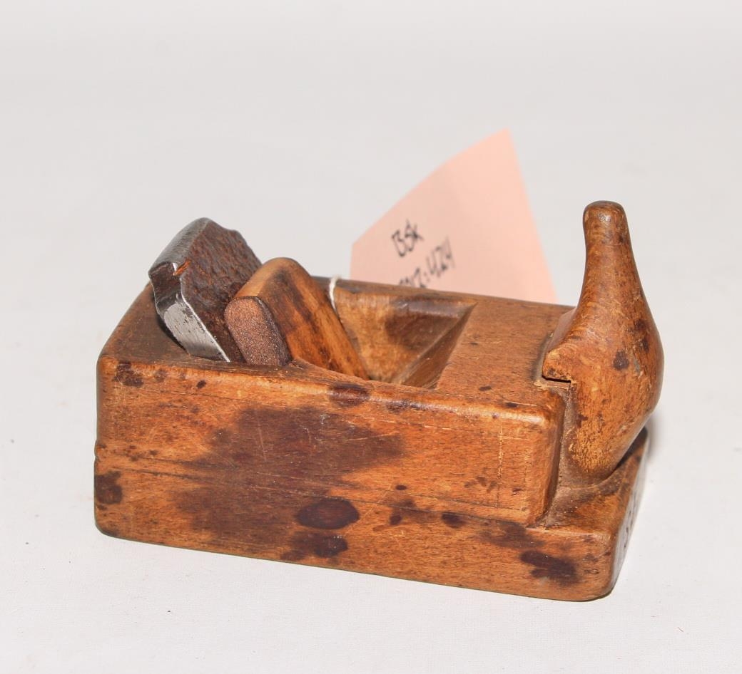 Hefill úr tré með járnblaði. L. 8 cm. Br. 3,5 cm. H. 3 cm. Járnblaðið/tönnin er fest með tréspjaldi sem heldur við og er skorðað á milli. Tönnin er mjög beitt. Handsmíðaður. Á endum eru stafirnir SJ þrykktir í.