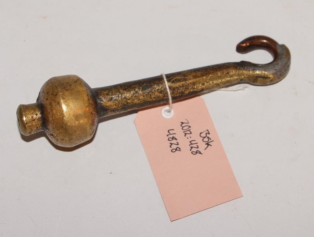 Kólfur úr messing. L. 13,5 cm. Þv. krókur 2,7 cm. Þv. kúla 3 cm. Krókurinn hefur einhverntíman brotnað af en bættur með koparbita sem er tinaður á. Frekar viðvaningslega gert. Gunnar Guðjónsson fann kólfinn fyrir mörgum árum í kjallaranum í Gúttó. Talið er að kólfurinn sé úr gamalli skólabjöllu en kennsla barna fór fram þar um tíma.