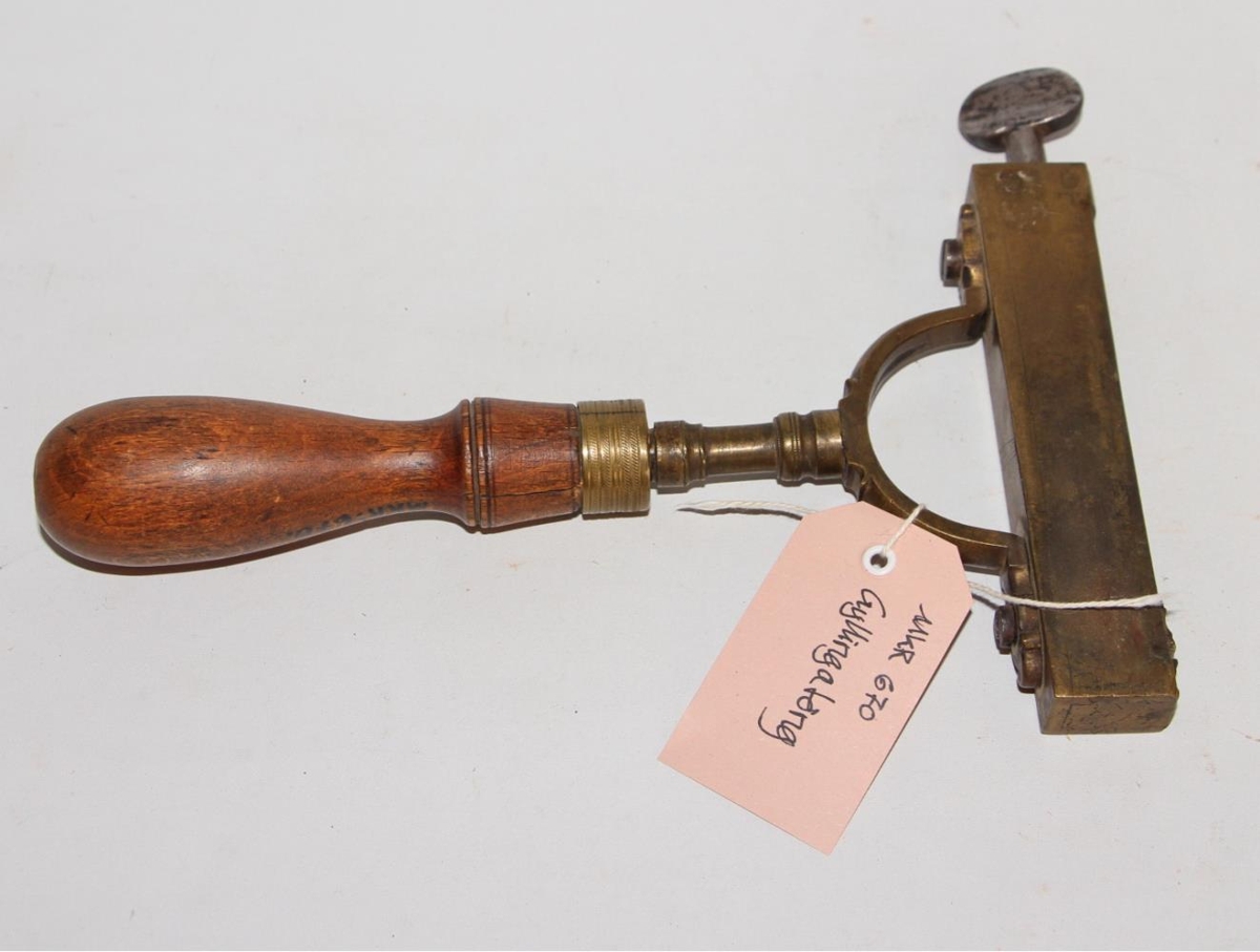 Gyllingatöng úr messing með tréhandfangi. L. 19,6 cm. Br. 14,1 cm þegar þvinga fyrir kubba er skrúfuð alveg inn. Handfangið er úr brenni, rennt með hjalt í endanum. Hjaltið er mynstrað. Gyllingaplatan er skrúfuð á handfangið með tveimur skrúfum. Þvingan er úr járni. Handfang er mjög laust.