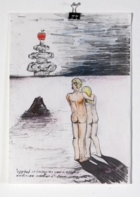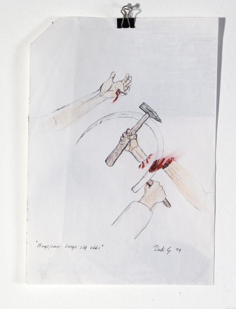Tvö blöð heftuð saman í efra vinstra horni. Á fremra blaðinu er teikning sem hefur verið ljósrituð og svo litað í með vaxlitum og tússi. Myndin er af tvei,ur nöktum einstaklingum (manni og konu) sem standa í óræðu landslagi. Þau snúa baki í áhorfanda og horfa á atomsprengju með eppli í stað svepps í sjálfri sprengingunni. Fyrir neðan parið stendur: 'Upphaf skilningsins var í eplinu, endirinn verður í Atomsprengjunni'Seinni myndin er einnig ljósrituð og fyllt upp í með litum. Á teikningunni má sjá eina hendi höggva aðra af með sigði eftir að sú hendi hefur hamrað nagla í þriðju hendina. Fyrir neðan stendur: 'Hugsanir borga sig ekki'