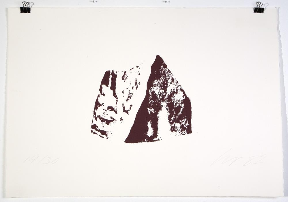 Silkiþrykk, dökkfjólublátt abstrakt-form á hvítum grófum pappír