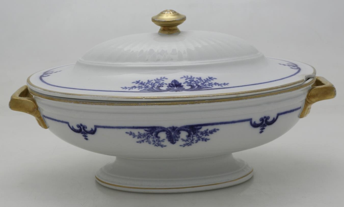 Kartöflufat með loki. L. 29; br. 17,9; h. 15,7 cm. Á því eru tvö eyru (höldur), gyllt og hnúður á loki er einnig gylltur. Kvarnast hefur úr barmi loksins á einum stað.