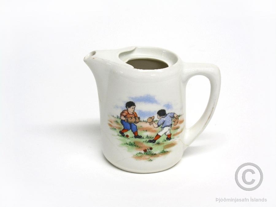Mjólkurkanna, leikfang, úr hvítum leir með áprentuðum litskrúðugum myndum beggja vegna. Annars vegar er mynd af tveimur börnum úti að boxa. Þau eru með boxhanska á höndum. Hins vegar er mynd af barni að leik með fótbolta. Sprungur eru í leirnum nálægt botni könnunnar. Stellið átti móðir gefenda (f. 1918) ásamt systrum sínum. Kannan er úr erlendu stelli og líklegt þykir að faðir þeirra systra hafi keypt hana í útlöndum. Hann stundaði sjómennsku og sigldi enskum togurum. Stellið er pólskt samkvæmt stimpli á botni og er að líkindum frá því um 1925. Stimpillinn sýnir fugl og þar fyrir neðan stendur: C.T. ALTWASSER SILESIA. Slíkir stimplar voru notaðir um 1925. Að auki eru tölurnar 2592, 50 og 9.