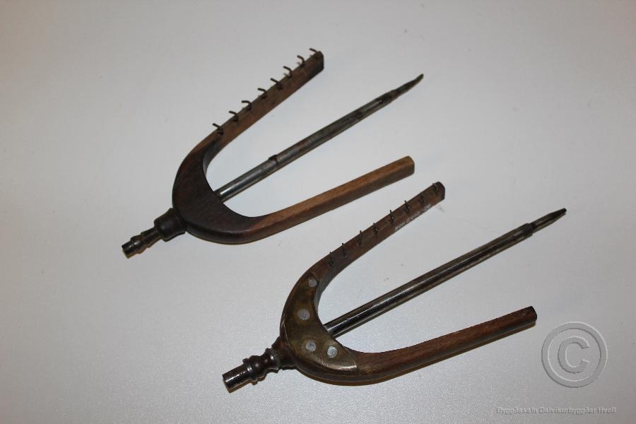 Aukahlutur á rokk, 2 stykki. Annað er viðgert. Mesta breidd á öðru trénu er 9,8 og á hinu 9,7 cm.