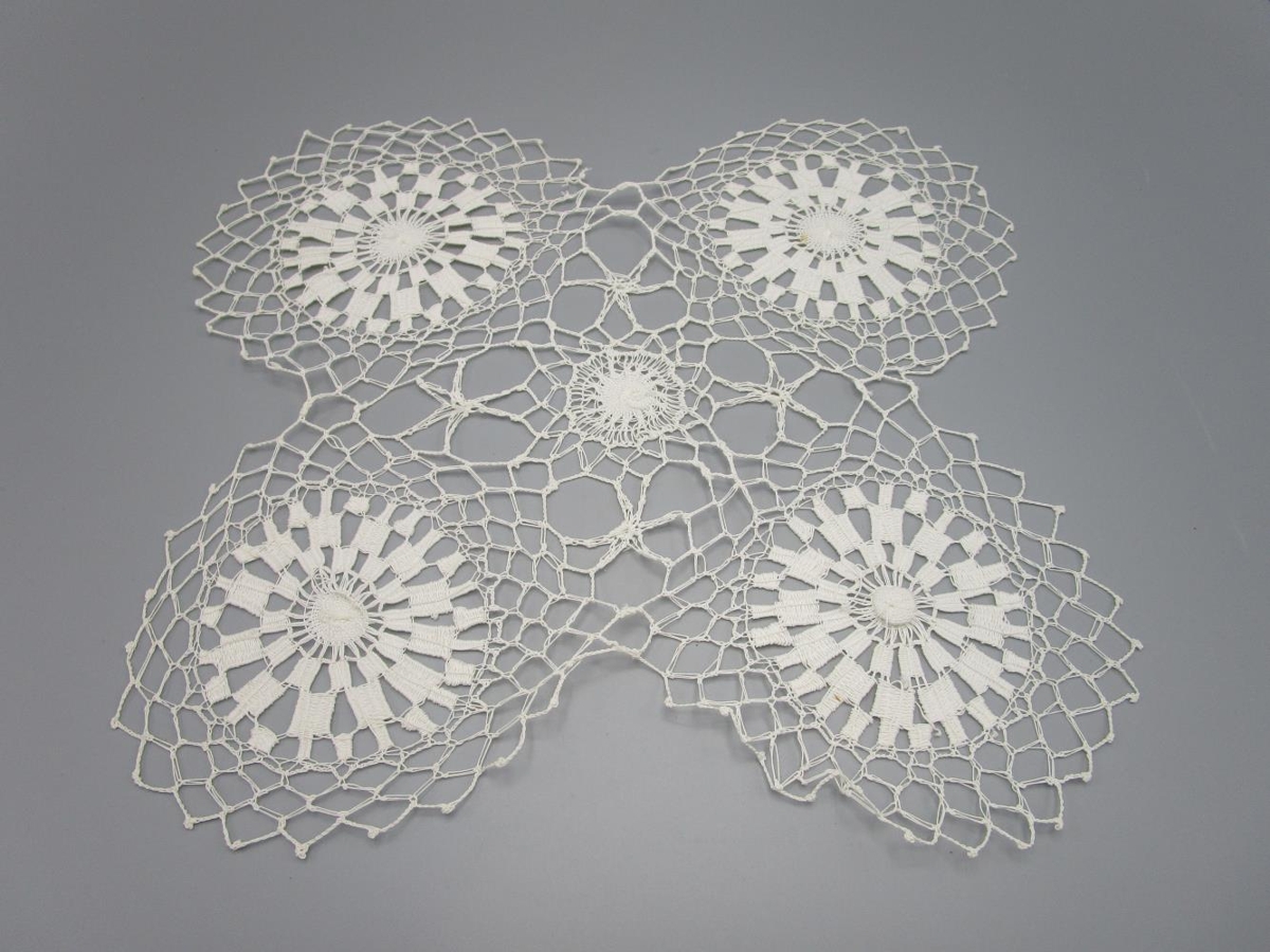 Hvítur dúkur úr mjög fínu hvítu garni. María Andrésdóttir gerði dúkinn með Teneriff aðferð þar sem notuð voru spjöld og nálar til að búa til dúllur sem svo voru festar saman. María gerði einnig dúka úr ull í sauðalitunum með þessari aðferð.