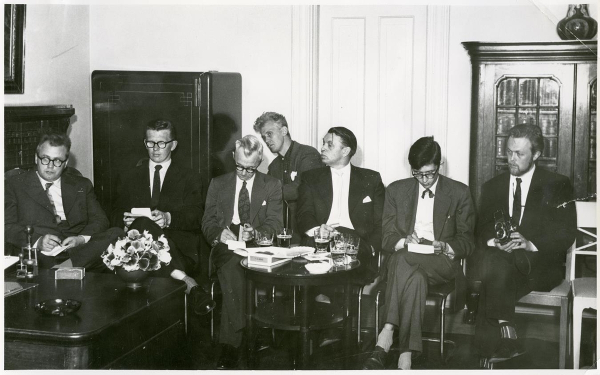 Nokkrir karlmenn sitja með skrifblokk á lærum og ljósmyndari yst t.h. Í horni við vegg í bakgrunni stendur stór peningaskápur.