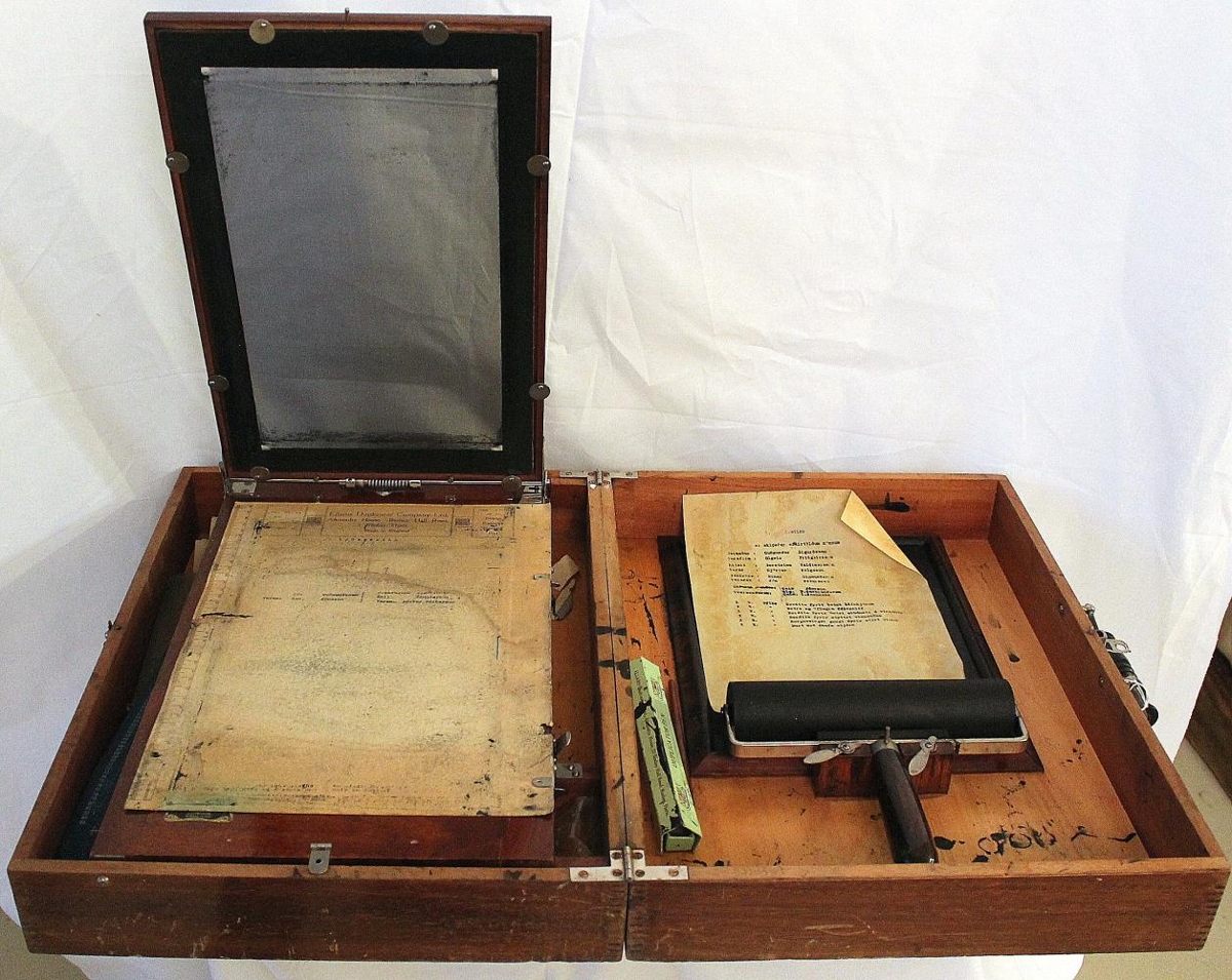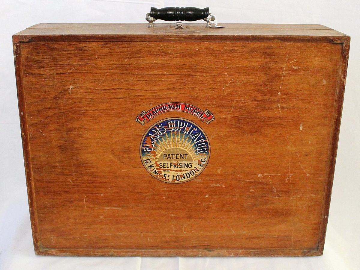Fjölritari úr Kiddabúð. DIAPHRAGM MODEL. ELLAMS DUPLICATOR. PATENT. SELF-RISING. 12 King St, London, EC.