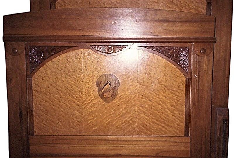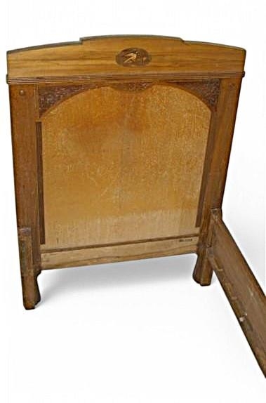Vandað hjónarúm í tveim samstæðum einingum, spónlagt. Útskurður og innlögn á göflum. Vönduð smíði. Hæð höfuðgafla 125 cm, fótagafla 91 cm.