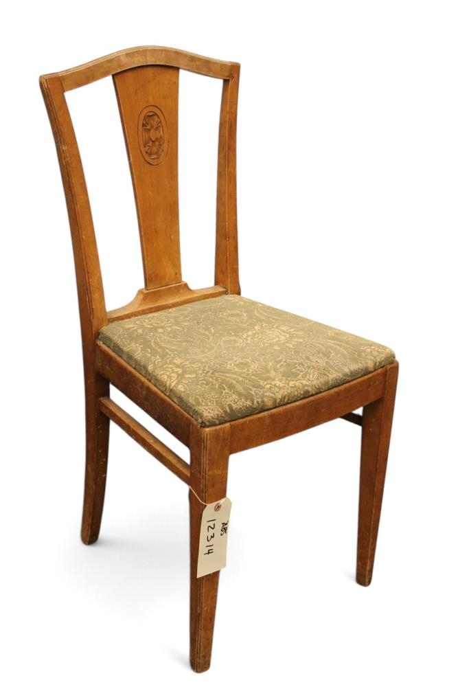 Viðarstóll, ljós viður, einfaldur án arma, bein bak, framfætur beinir. Útskorið blóm á baki. Seta með grænu áklæði. Hluti af setti.