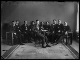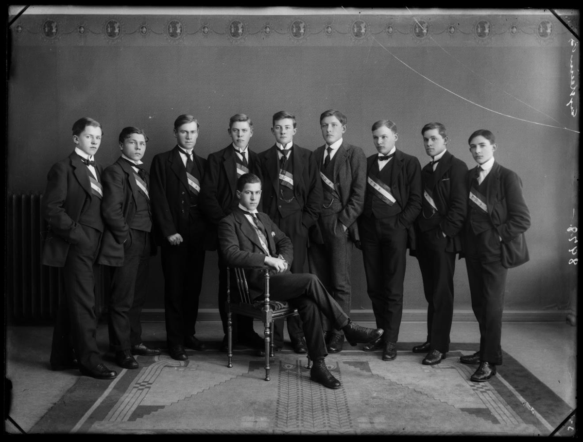 10 saman Bekkjarfélagar úr Verslunarskólanum T. f. v.: óþekktur, Hálfdán Bjarnason ræðismaður í Genúa, óþekktur, Einar Steindórsson framkvæmdastjóri Hnífsdal, Ragnar Blöndal kaupmaður, Eysteinn Bjarnason kaupmaður Sauðárkróki, Sigurður Waage framkvæmdastjóri, óþekktur, Jón Björnsson bókari og Valgarð K. Blöndal póstafgreiðslumaður Sauðárkróki. 1919.