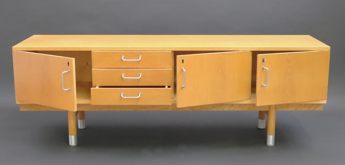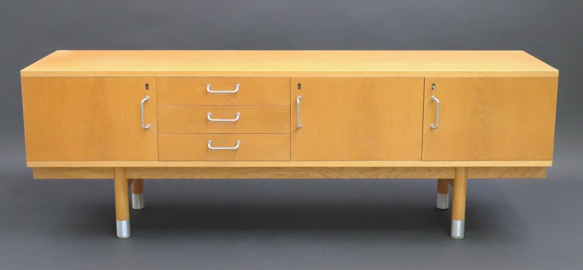Skrifstofuskápur / skenkur úr tré með einföldum járnhöldum að framan. Hann skiptist í fjögur jafnstór rými. Þrjú þeirra eru heil með skápahurðum, læsanlegum. Fjórða er með þremur jafnstórum skúffum í stað hurðar. Fætur skápsins eru klæddar málmi neðst við gólf. Skápurinn kemur af skrifstofu borgarstjóra í Austurstræti 16.