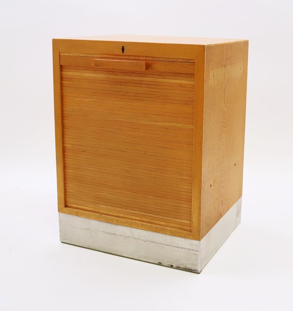 Lítill skápur með rennihurð - opnast niður lóðrétt og er með lás fyrir lykil. Einingin er úr tré og sökkull er klæddur með stálplötu. Hefur fylgt stærri skrifstofueiningu / skápum. Þetta er hluti af stærri safnheild sem kom frá skrifstofu borgarstjóra í Austurstræti 16 til 1992, þegar flutt var í núverandi ráðhús.