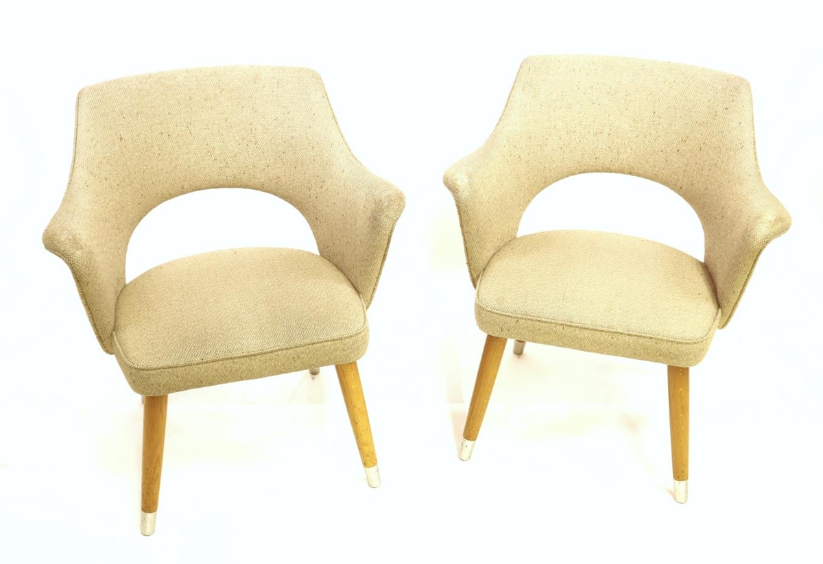 Hægindastóll. Seta, bak og armar klætt ljósu, yrjóttu ullaráklæði. Viðararmar og fætur. Málmur neðst á fótum.