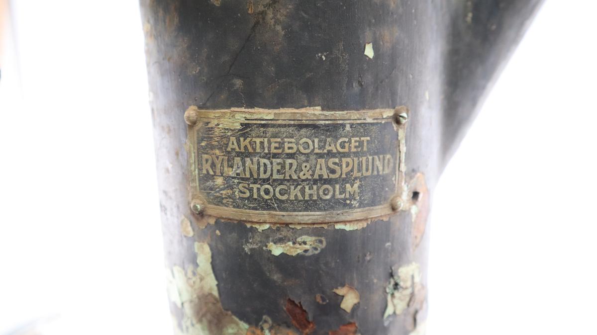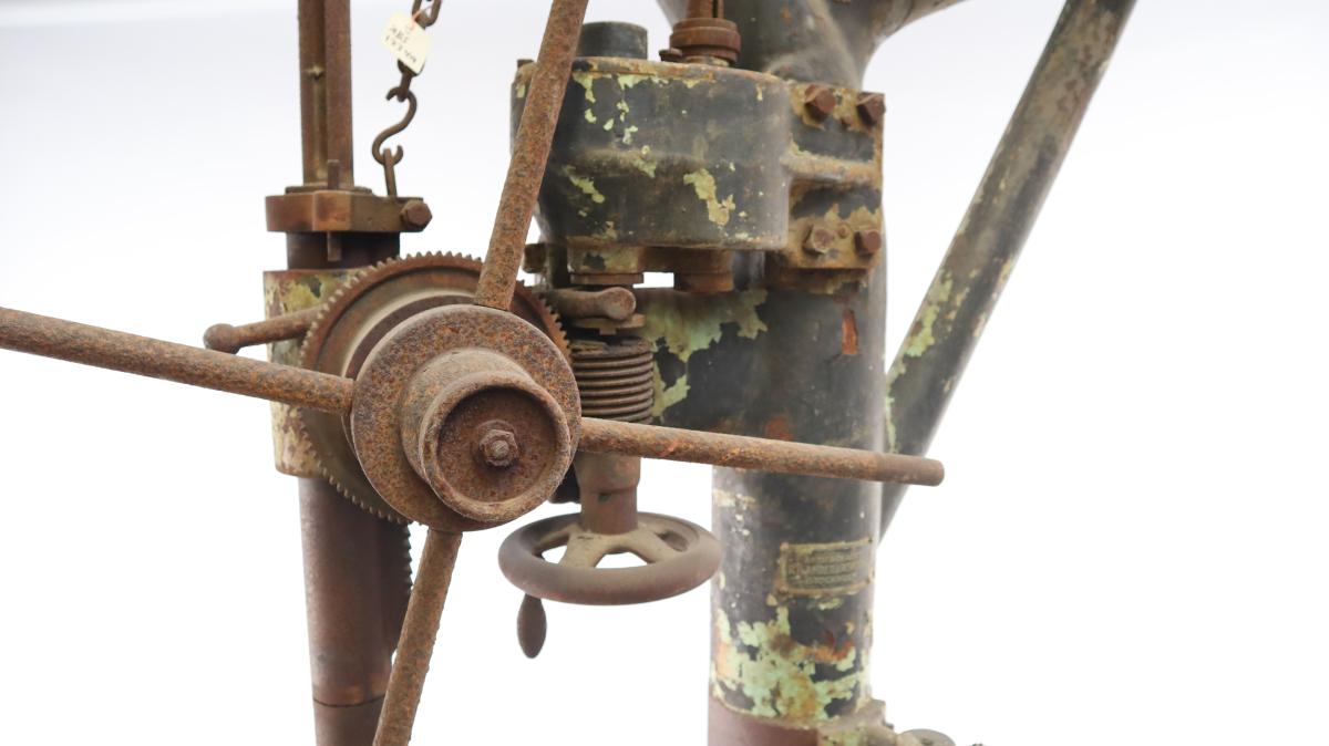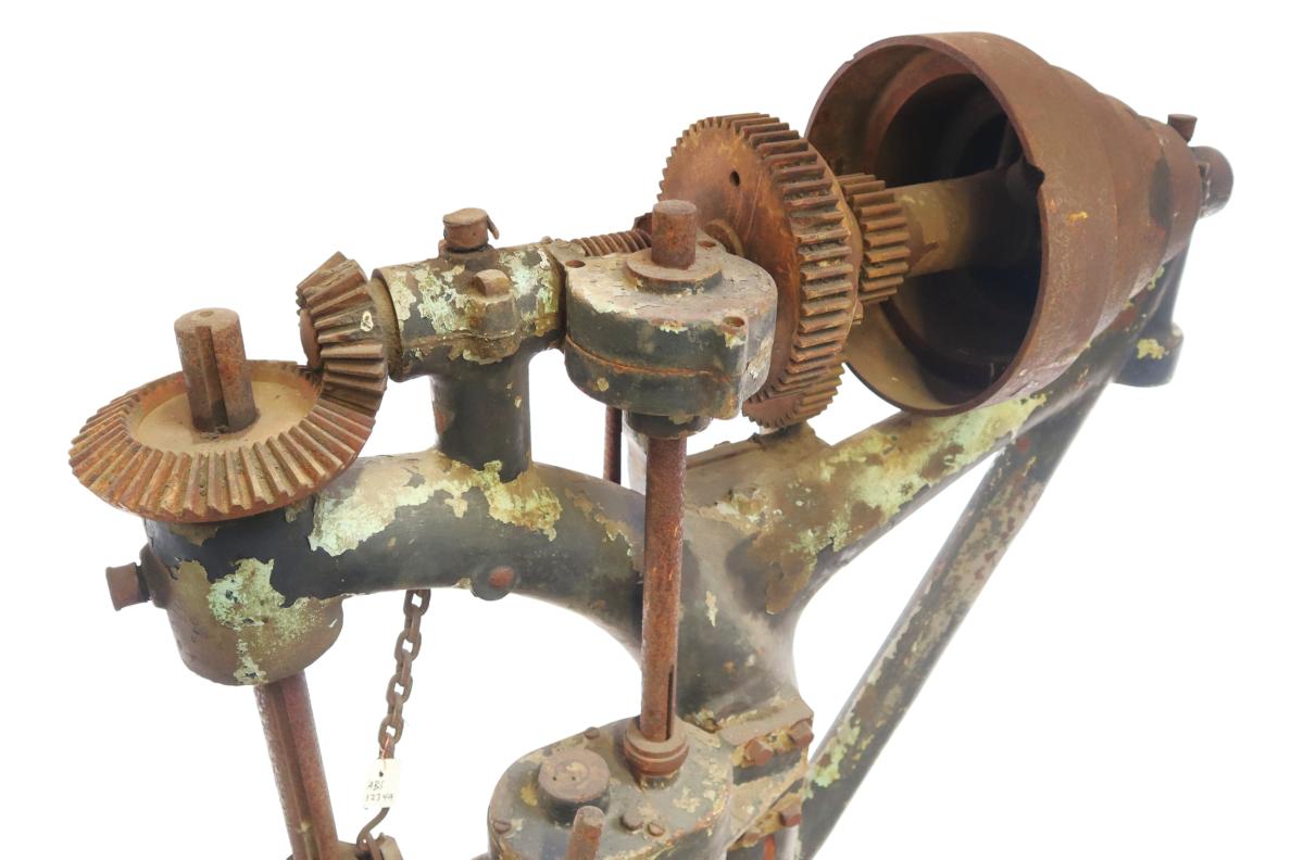 Borvél. Málning er að mestu farin af svo ryð þekur hana.. Var tengd með reim við öxul uppi í lofti. Kom úr járnsmiðju sænska frystihússins í Reykjavík, sem var starfandi frá 1930 til 1967-68. Var húsið þá notað í öðrum tilgangi.