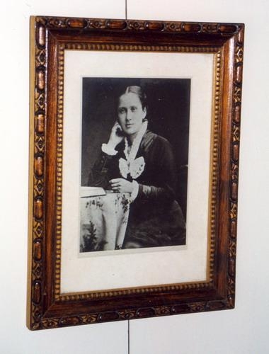 myndin er í útskornum tréramma, bæsuðum.