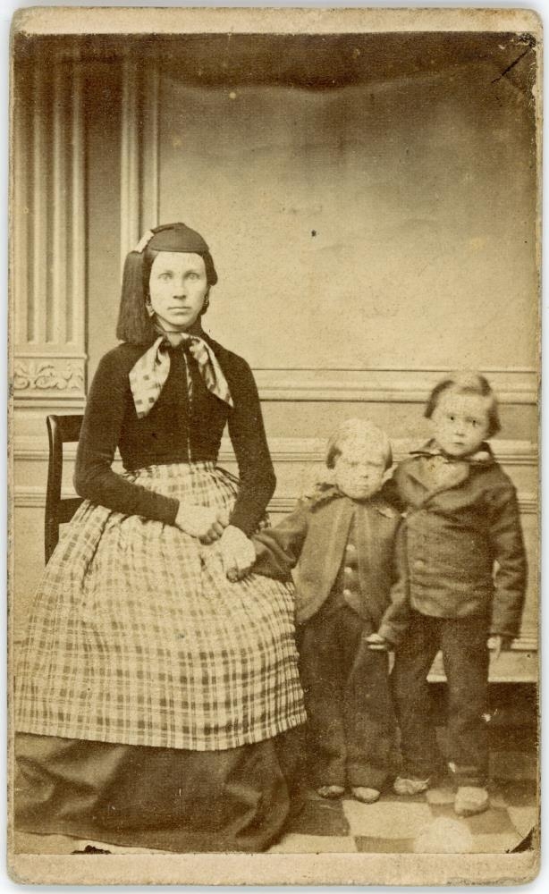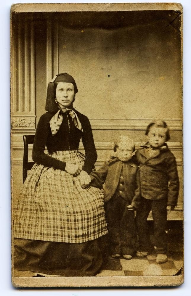 Rannveig Ólafsdóttir, fyrri kona Brynjólfs Oddssonar bókbindara og Oddleifur og Þorvarður synir þeirra, myndin kvað vera frá 1865 eða 1866.