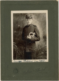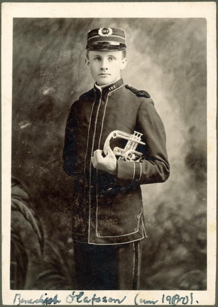 Hann er klæddur í einkennisbúning og með húfu með stöfunum IOF, mögulega The Independent Order of Foresters.