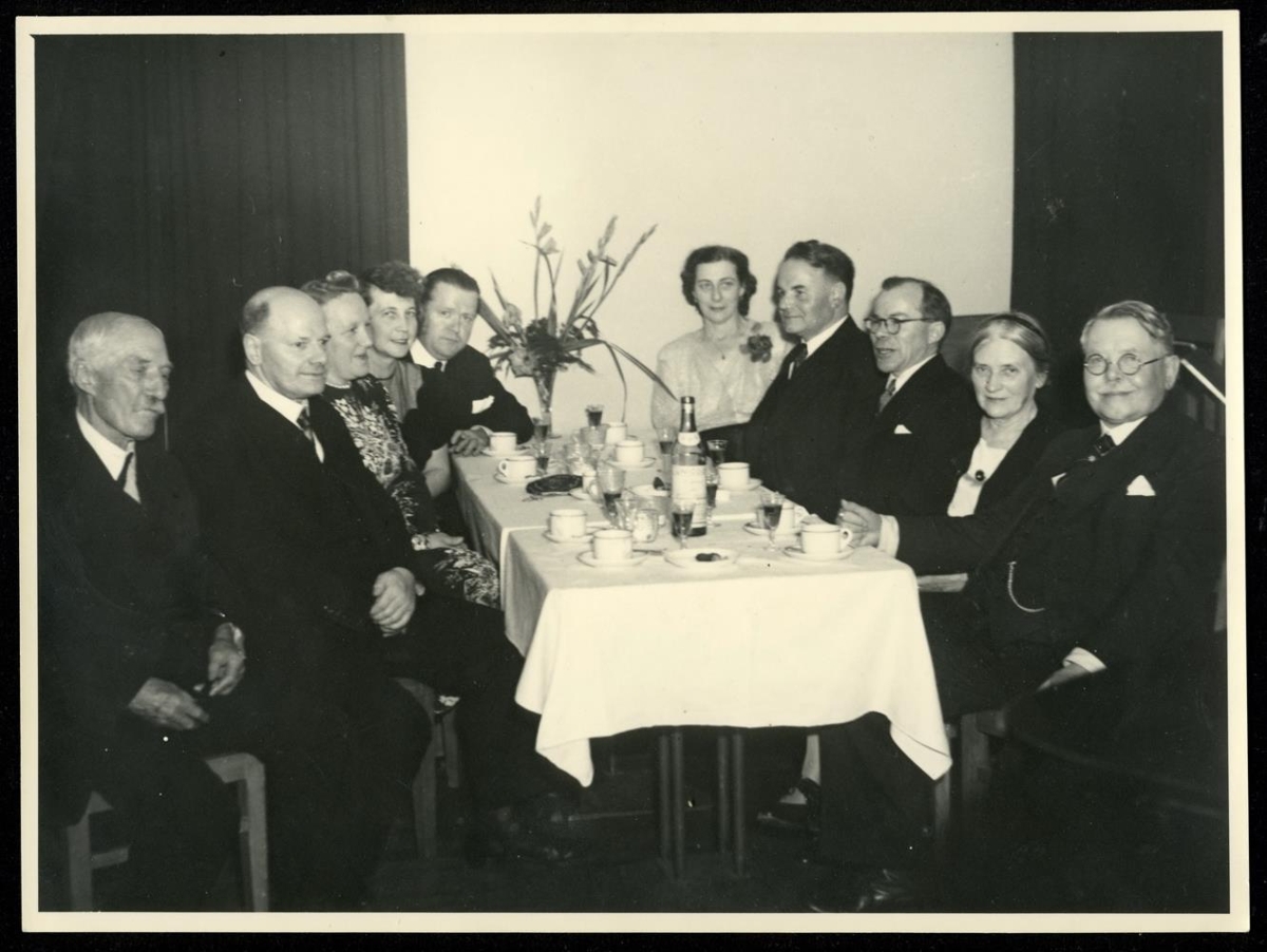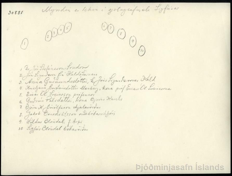 Dr. Jón Stefánsson, Lundúnum, Jón Sigurðsson skrifstofustjóri frá Kaldaðarnesi, Anna Guðmundsdóttir kona hans, Einar Ól Sveinsson prófessor, Kristjana Þorsteinsdóttir Manberg kona hans, Björn K. Þórólfsson skjalavörður, Guðrún Pálsdóttir kona hans, Jakob Benediktsson orðabókarritstjóri, Sigfús Blöndal bókavörður, Hildur kona hans, f. Arpi.