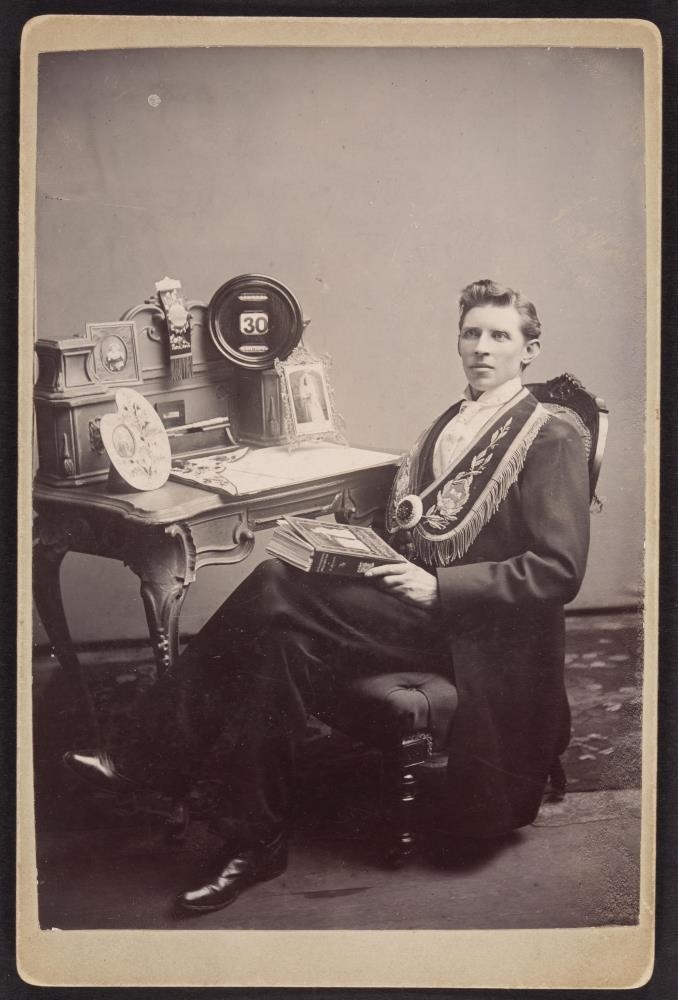 Borgþór Jósefsson bæjargjaldkeri í Reykjavík. Situr í stól við skirfpúlt. á borðinu eru ljósmyndir, dagatal sem sýnir sunnudaginn 30. ágúst og fleiri hlutir. Hann heldur á bók eða albúmi.
