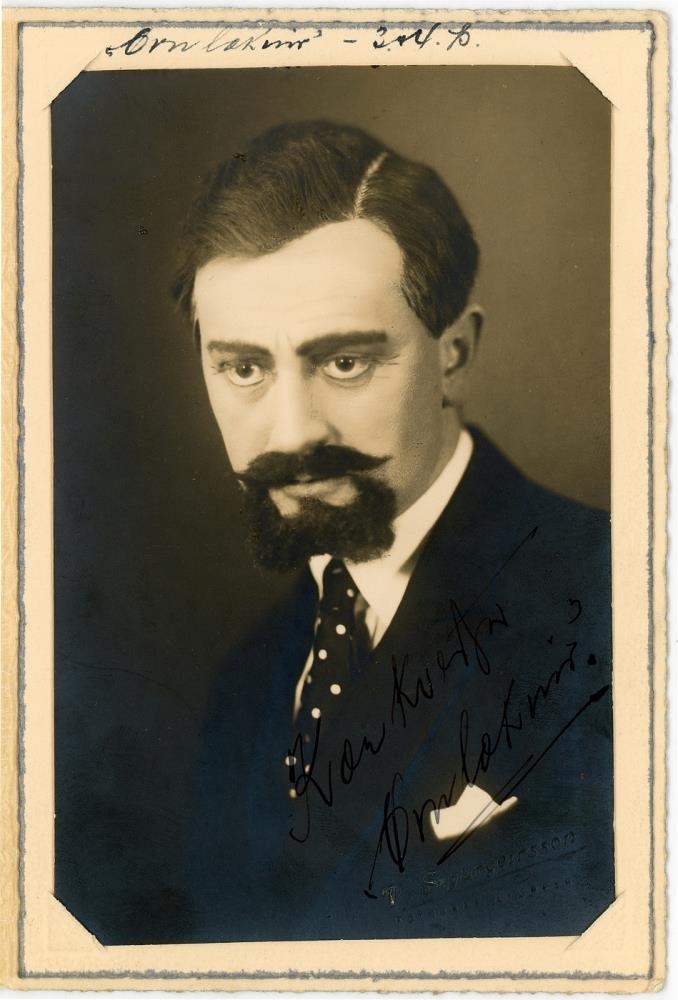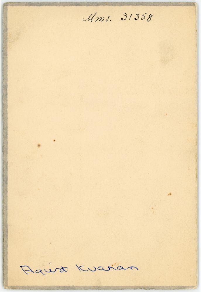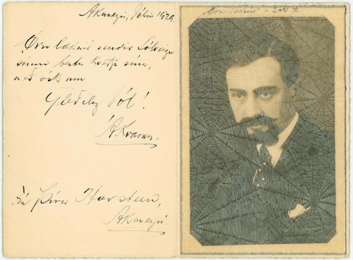 Ágúst Jósefsson Kvaran leikari, í hlutverki sem "Örn læknir". Í spjaldmöppu. Á spjaldið er skrifuð jólakveðja til Þóru Havsteen (Vigfúsdóttur), frá Ágústi Kvaran sem "Erni lækni".