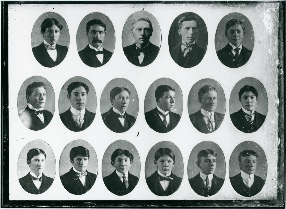 Efsta röð frá vinstri. Eyjólfur Stefánsson frá Kleifum, Guðmundur Eyjólfsson Geirdal kennari, sr. Ólafur Ólafsson skólastjóri, Páll Ólafsson kennari, Magnús Vigfússon frá Akranesi.