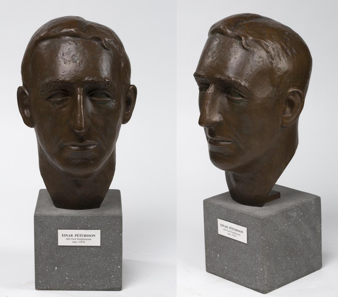 Bronsstytta (höfuð), h. 44.cm., af Einari Pjeturssyni. Gefin í minningu þess að 12. júni 1983 eru 70 ár liðin frá því að Einar reri út á Reykjavíkurhöfn með bláhvíta fánann, sem sjóliðar af Islands Falk tóku. Myndina gerði Gestur Þorgrímsson.
