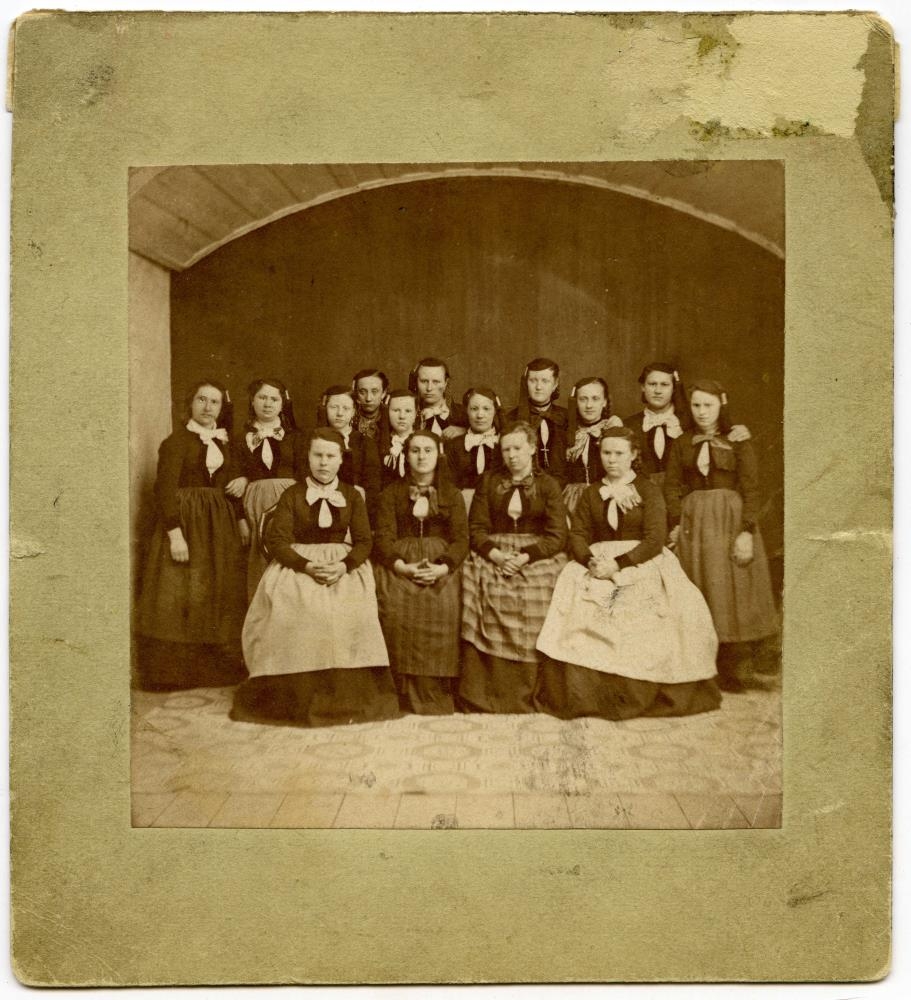 Ljósmynd af námsmeyjum í efri bekk Kvennaskólans í Reykjavík 1878-79, eftir Sigfús Eymundsson. Spjaldst. 10,6 x 11,7 cm. Á myndinni eru þessar 15: Helga Guðbrandsdóttir frá Hvítadal, kona Böðvars kaupmanns Þorvaldssonar á Akranesi síðar, Guðný Jónsdóttir frá Auðkúlu, Ólafía Jóhannsdóttir, Magnea Jónsdóttir (síðar kona Kr. Ó. Þorgrímssonar), Anna Jónsdóttir (síðar gift Stefáni lækni Gíslasyni), Láretta Þorvaldsdóttir, prests Böðvarssonar, Anna, Kristjana Zoëga (síðar Thorsteinsson), Jóhanna Arnljótsdóttir Ólafssonar (hin eldri), Vilborg Jónsdóttir (systir Guðnýjar, síðar gift Eiríki próf. Gíslasyni á Stað, Sigríður Jónsdóttir frá Finnbogabæ í Reykjávik (síðar gift Þórarni Guðmundssyni á Seyðisfirði), Sigurlaug Árnadóttir frá Höfnum (kona séra Ludvigi ......), Katrín Skúladóttir Sívertsen (kona Guðmundar prófessor Magnússonar) og Þóra Torfadóttir (systir Siggeirs kaupmanns Torfasonar í Reykavík).