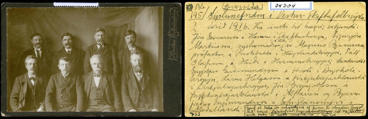 Sýslunefndin í V.-Skaftafellssýslu árið 1916 Hópmynd, sýslunefndin í V.-Skaftafellssýslu árið 1916?. Neðri röð frá v.: Jón Einarsson, Hemru, Skaftártungu, Sigurjón Markússon sýslumaður, Vík, Sr. Magnús Bjarnarson Prestsbakka, Páll Ólafsson Heiði, Mýrdal. Efri röð frá v.: Eyjólfur Guðmundsson, Hvoli, Mýrdal, Lárus Helgason, Kirkjubæjarklaustri, Jón Brynjólfsson Þykkvabæjarklaustri, Álftaveri og Bjarnfreður Ingimundarson Efri-Steinsmýri, Meðallandi.