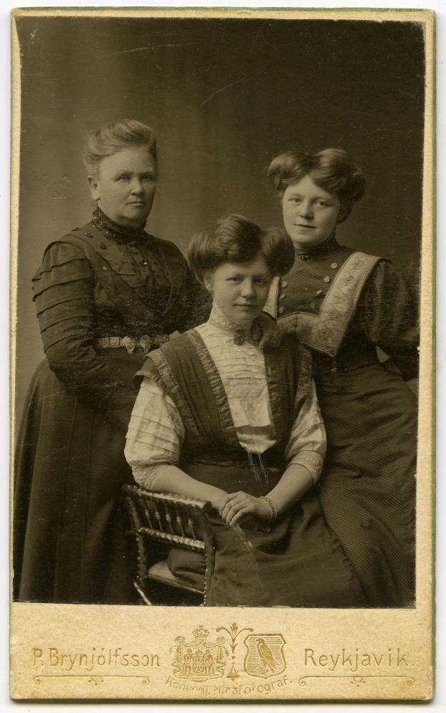 Þrjár konur: Jarþrjúður og Jóhanna Sigþrúður ljósmyndari, dætur sr. Péturs Jónssonar, Kálfafellsstað, og Jarþrúður Jónsdóttir Péturssonar, kona Hannesar Þorsteinssonar þjóðskjalavarðar.