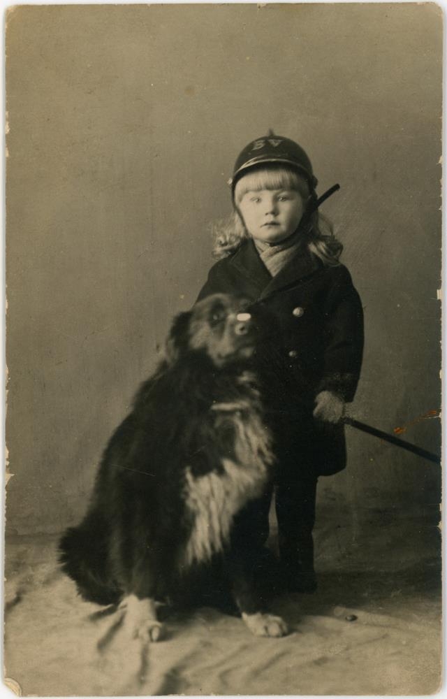 Lítill strákur með sítt hár, hermannahatt og leikfangasverð. Við hlið hans situr hundur.