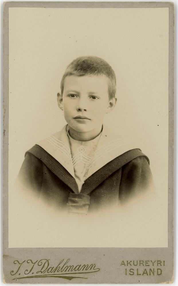 Aftan á mynd stendur: „Björn O. Björnsson Akureyri. 12 ára, myndin tekin er hann fór í gagnfræðiskólann."