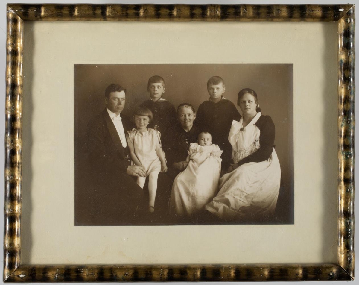 Aðalsteinn Pálsson skipstjóri, kona hans (fyrri) Sigríður Pálsdóttir, börn þeirra Össur, Páll, Sigríður og Guðbjörg, ennfr. Helga Jóakimsdóttir, móðir Sigríðar Pálsdóttur. Ljósm. 18,3 x 23,3 cm, í 1,2 cm br. ramma.