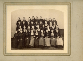 Hópmynd, 36 konur, Kvennaskólinn í Ytri-Ey Ljósm. 16,6 x 21,5 cm, spjaldst. 24 x 33 cm: Hópmynd, 36 konur, Kvennaskólinn í Ytri-Ey, líklega 1891-1892. Á myndinni hefur ein þekkst, Margrét K. Jónsdóttir frá Hjarðarholti í Dölum, dóttir sr. Jóns Guttormssonar.