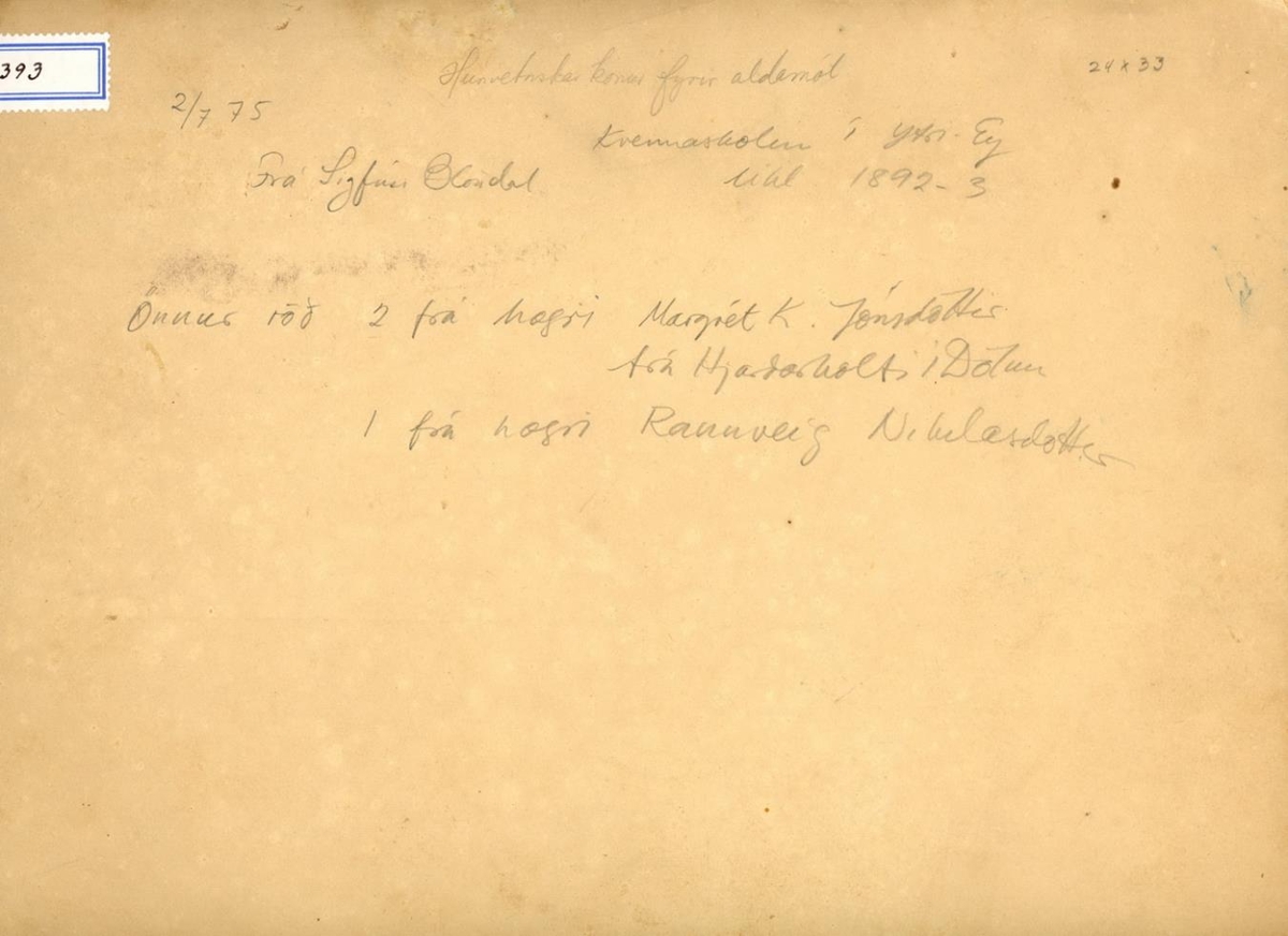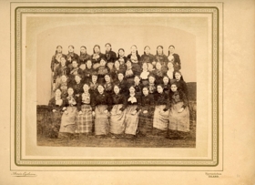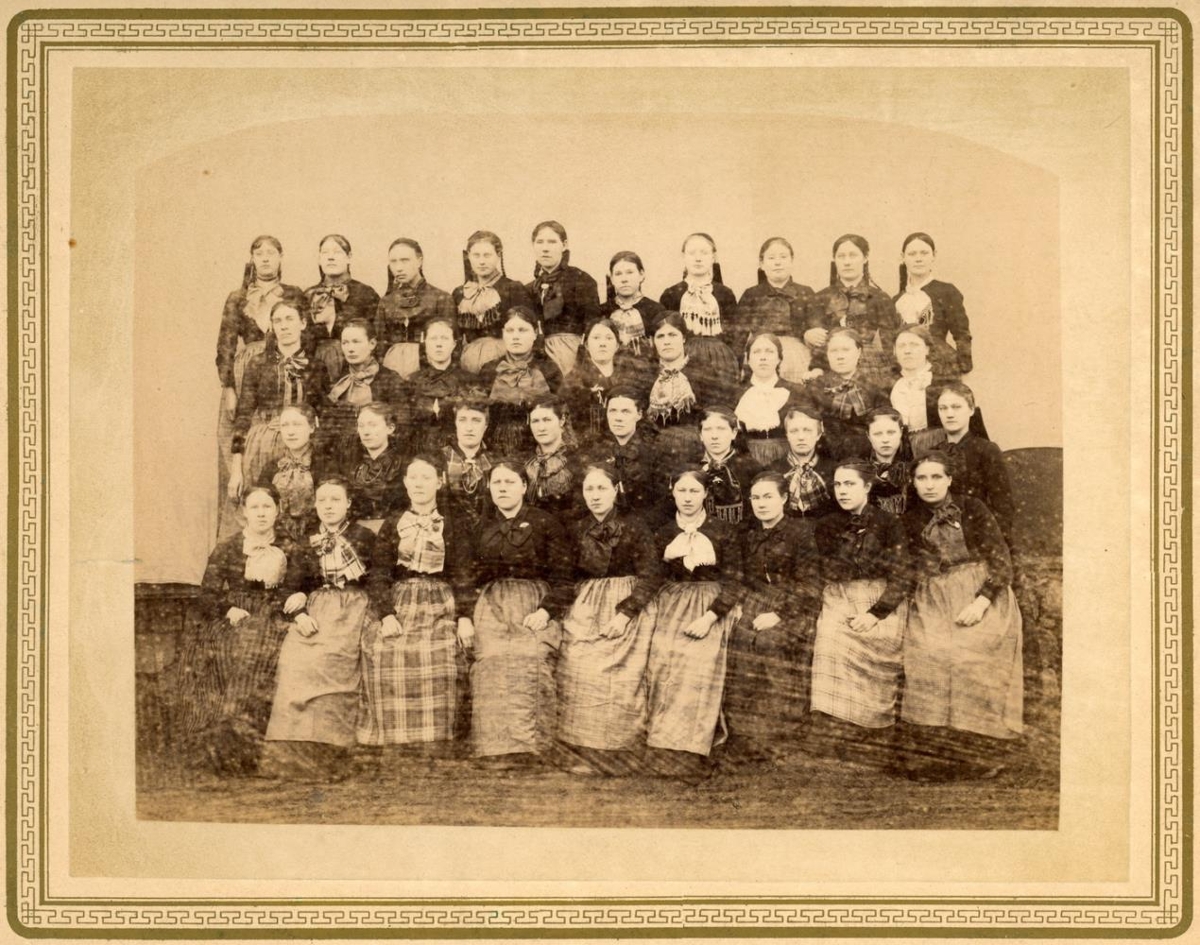 37 kvenna hópur, Kvennaskólanum í Ytri-Ey, líklega 1892-1893. 2 konur þekkjast: Margrét K. Jónsdóttir, sbr. 36392 og Rannveig Nikulásdóttir. Ljósm. 16,6 x 21,5 cm, spjaldstærð 24 x 33 cm: