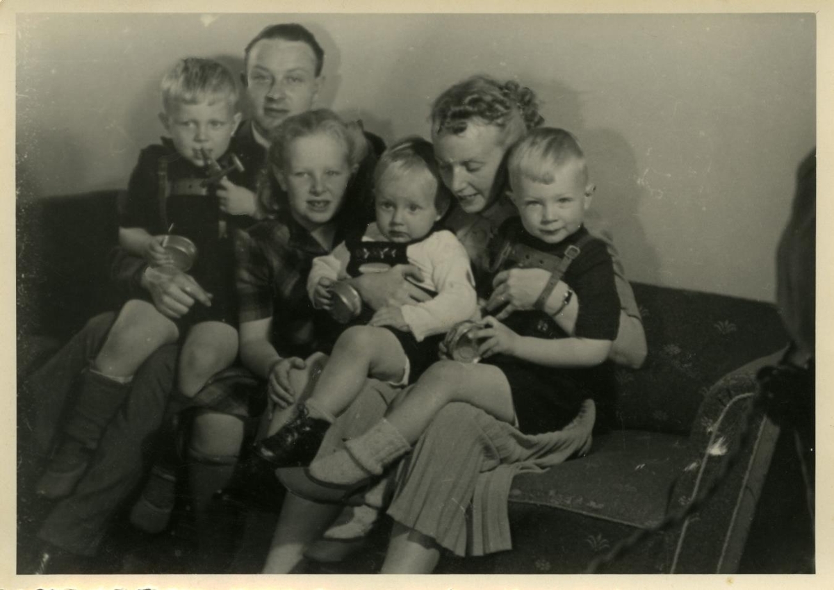 Kona hans Hulda og börn þeirra 4, um 1950. Ljósm.: 11,6 x 8,4 cm.: Rafn Jónsson