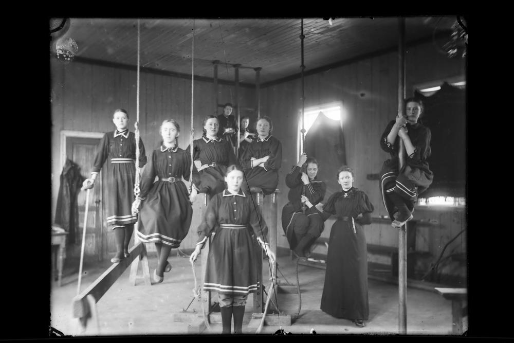 „Þetta er Ingibjörg H. Bjarnason síðar alþingiskona og skólastjóri með leikfimikennslu í Kvennaskólanum. Hún stendur t.h. Gæti verið 1894-95, alla vega sömu búningar og á hópmynd 9236.“ (ILB 2015)