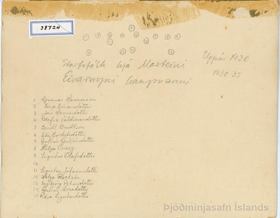 Aftari röð frá vinstri: Gunnar Ísberg Hannesson (1915-1976), tvær ónefndar, (Valdimaría) Ólafía Valdemarsdóttir (Lóa) (1906-1981), Bendt Bendtsen (1906-1998), (Sigríður) Elín Þorkelsdóttir (1903-1980), Guðrún Guðjónsdóttir (Gunna Guðjóns) (1907-1960), Helga Jóhannsson f. Craig (1910-1992) og ónefnd. Fremri röð frá vinstri: Rósa Sigurðardóttir (1899-1977), (Guðbjörg) Sigríður Ólafsdóttir (Sigga Ólafs) (1902-1989), tvær ónefndar, Guðrún S. Árnadóttir (Gunna Árna) (1905-1999) og ónefnd. (ES 2018)