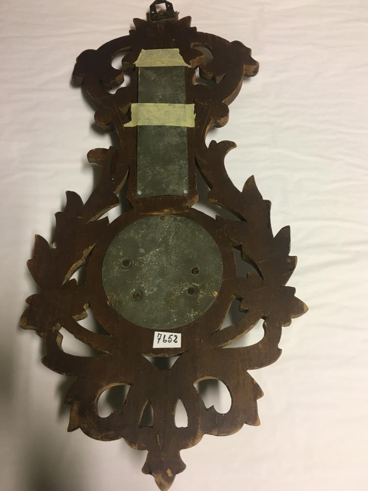 Loftvog (baromet) úr eigu Hannesar Sigurðssonar á Brimhólum. Útskorin tréumgjörð. Þýsk. Hitamælir ofan við loftvogina hefur orðið fyrir áfalli. Hannes keypti gripinn á uppboði í Vestmannaeyjum.