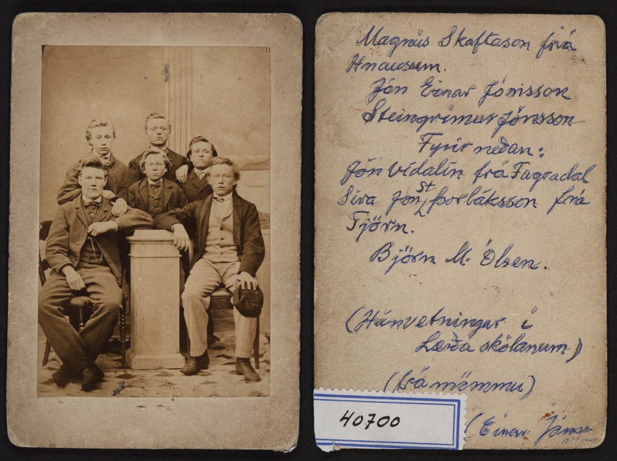 6 saman. Hópmynd, 6 saman, „Húnvetningar í Lærðaskólanum“: Magnús J. Skaftason prestur, síðast í Vesturheimi, Jón Einar Jónsson, Ingunnarstöður, sr. Steingrímur Jónsson, Garpsdal, Jón Vídalín frá Fagradal, sr. Jón St. Þorláksson, Tjörn, Vatnsnesi og Björn M. Ólsen rektor og prófessor.