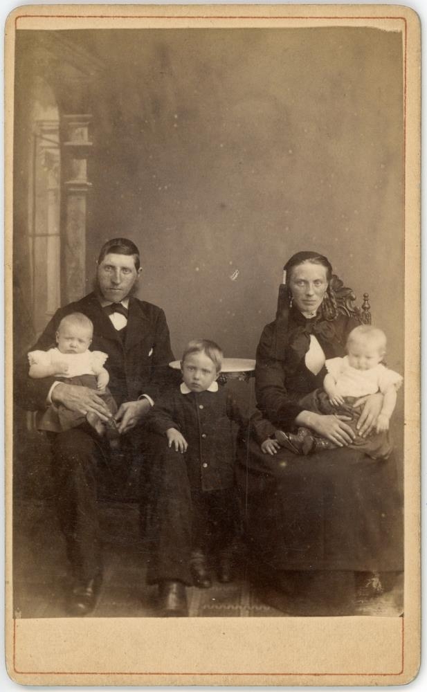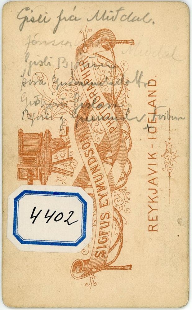 „Er afkomandi Gísla Björnssonar ( langafi minn) og Magneu Þóru Margrét Guðmundsdóttur (langamma mín). Skráning á persónum þ.e. á ungabörnum á mynd er röng. Þar eru tvíburar; Björn Gíslason 9. des. 1886 - 30. ágúst 1887 og Guðmundur Gíslason 9. des. 1886 - 22. ágúst 1887. Aðrir á mynd eru rétt; Gísli Björnsson 21. des. 1853 - 17. sept. 1928, Magnea Þóra Margrét Guðmundsdóttir 24. júní 1860 - 20. nóv. 1939 og Guðbjörn Gíslason 28. nóv. 1884 - 1. okt. 1919. Ritun á bakhlið segir það sama. Myndin er tekin 1887, rétt áður en tvíburarnir létust, en þá var Gísli langafi minn húsvörður í Lærða skólanum (MR) til nokkurar ára.“ (RE 2022)