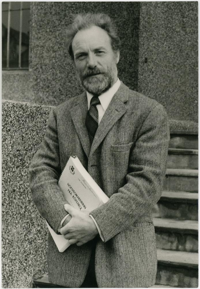 Karlmaður í jakkafötum stendur fyrir framan Þjóðleikhúsið, hann heldur á stóru hefti (handriti) með merki Þjóðleikhússins, á heftinu stendur Höfuðsmaðurinn frá Köpenick. Árni fór með hlutverk í leikritinu hjá Þjóðleikhúsinu árið 1971.