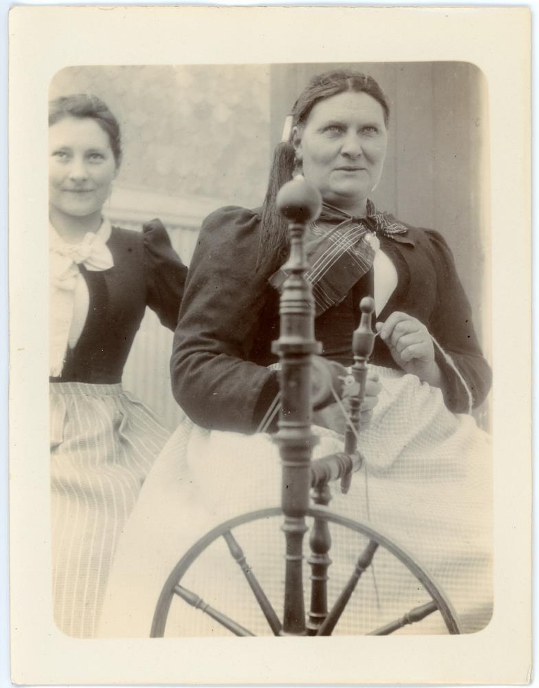 2 saman. Frú Margrét Zoëga, situr við rokkinn og spinnur, og Sveinlaug Halldórsdóttir, sem nú er kona Sigurðar gestgjafa/kaupfélagsstjóra Kristjánssonar í Hafnarfirði.