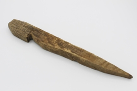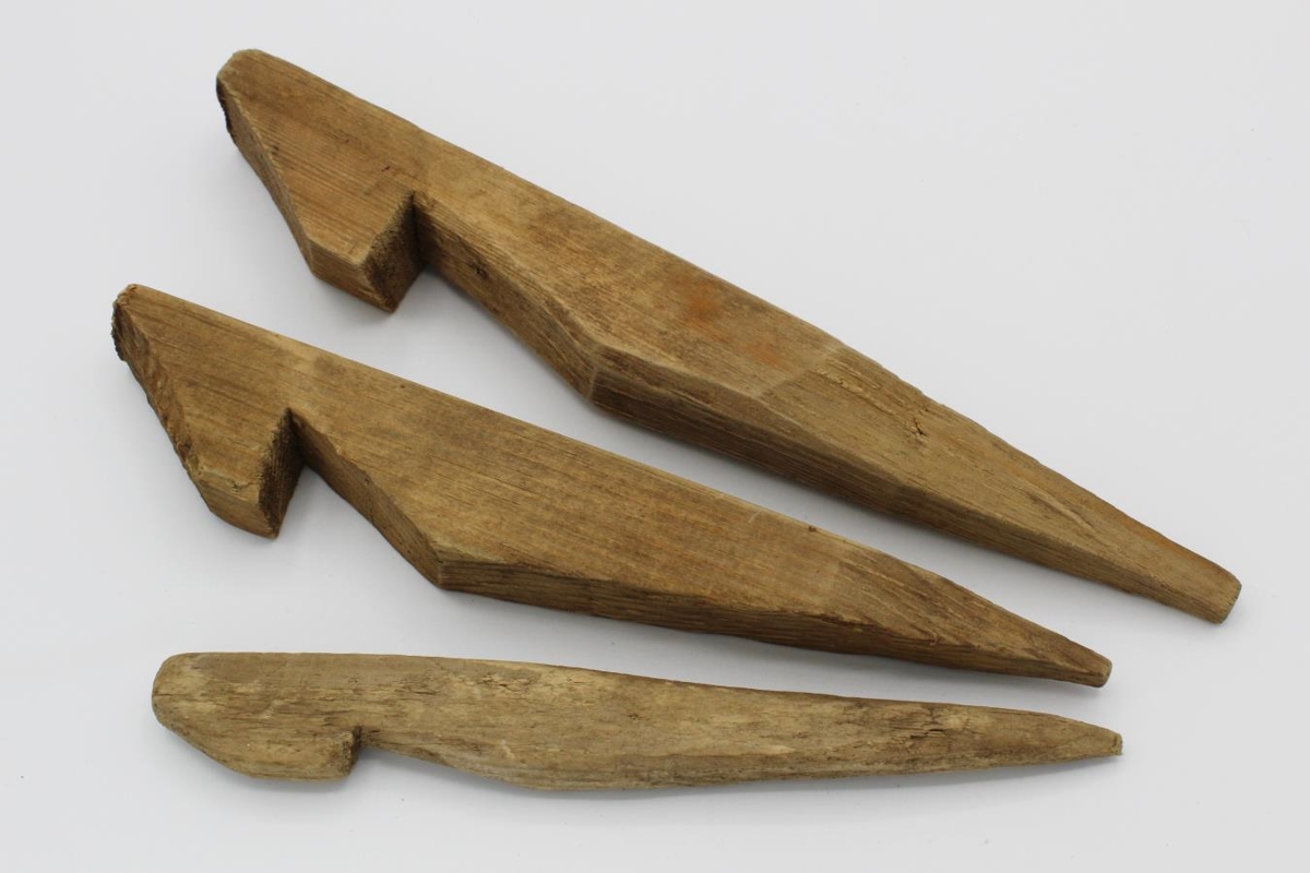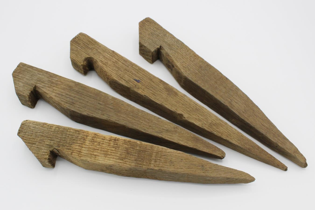 Trétjaldhælar í mismunandi stærðum, handgerðir. Einn er 32 cm langur, einn 28 cm, þrír eru 24,5 cm, einn 23 cm, einn 19,5 cm og sá minnsti er 16,5 cm. Molararleifar var á þeim flestum en burstað af við skráningu. Svipað handbragð er á þeim öllum nema þeim minnsta sem er meira pússaður. Ástandið á þeim er þokkalegt Þessir tjaldhælar voru í Húsinu á Eyrarbakka þegar Auðbjörg Guðmundsdóttir keypti það ásamt manni sínum árið 1979.