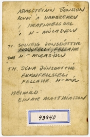 Póstkort. Hópm. Aðalsteinn Jónsson b. Vaðbrekku Hrafnkelsdal, Sólveig Jónsdóttir Ekkjufelli, Fellum, Jóna Jónsdóttir, Ekkjufellsseli, Fellum.