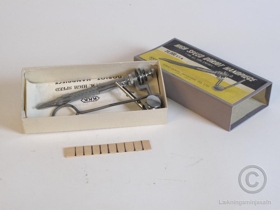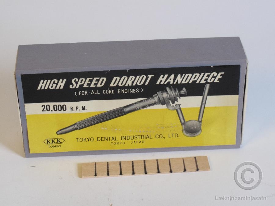 Handstykki (fyrir tannbora) í kassa, ásamt leiðbeiningabæklingi á ensku og japönsku.