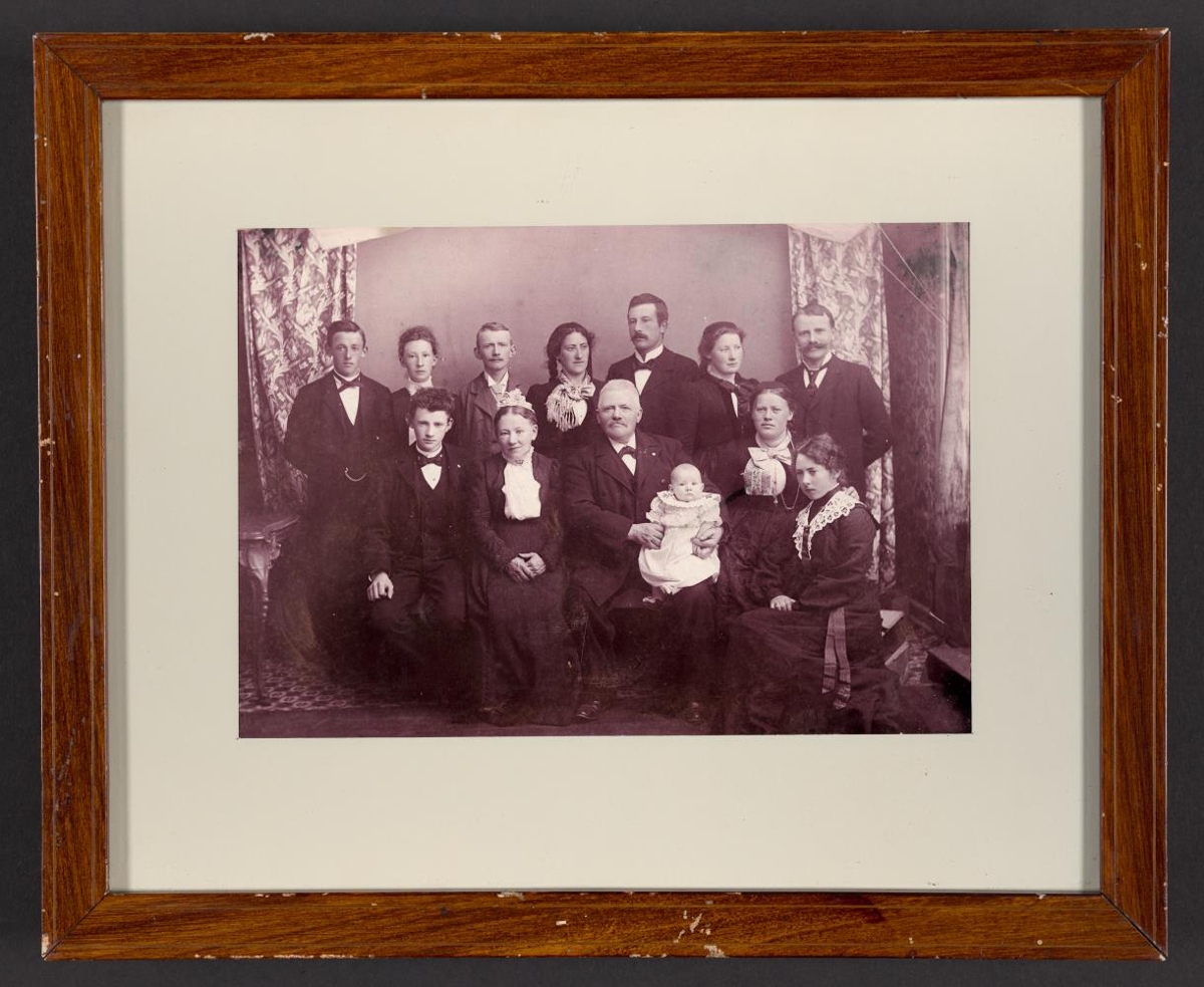 ramma: Hópmynd, 13 manns, Sigurður Jónsson fangavörður, k.h. Marie Katrine,