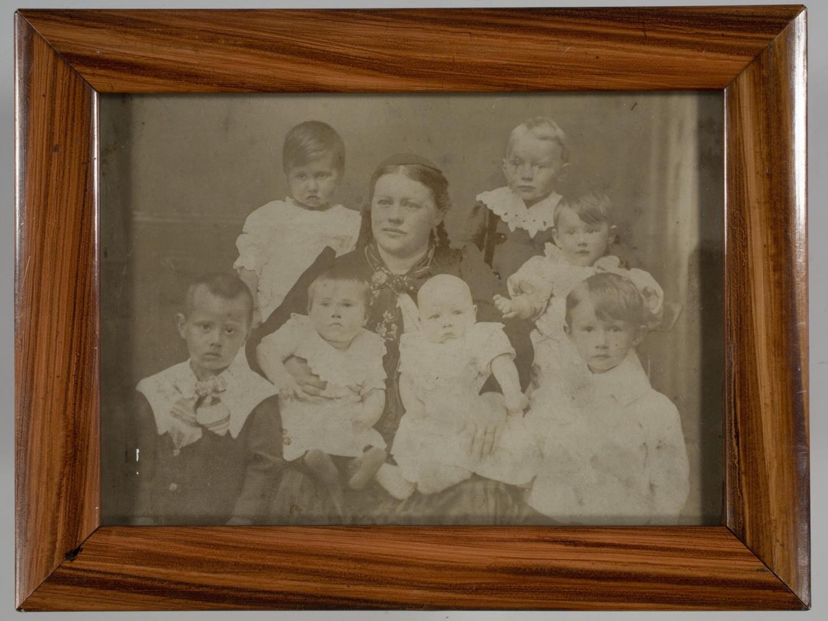 Hópm. kona og 7 ung börn. Ljósm. um 11 x 15 cm., í 2 cm.